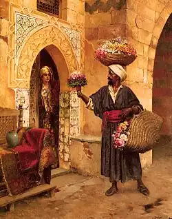 A flower seller, traditionally a woman, sells flowers on the street. Often the flowers are carried in a basket, for example. The subject matter has been a favorite of artists.[1][2] The profession has mostly died out in countries like the United Kingdom, but still exists in others such as India.