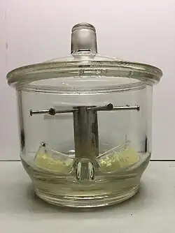 The material under test is suspended inside a container over a source of powdered sulfur. The powdered sulfur is placed in a dish. The temperature and internal humidity of the container are regulated. Temperature is typically controlled by placing the container in a constant temperature oven. Humidity inside the container is typically controlled with a saturated salt solution whose vapor pressure is well characterized at the temperature of the test.[8] Saturated potassium nitrate solution is standard practice for humidity control in humid sulfur vapor testing. The saturated salt solution is placed physically outside of the sulfur containing dish. The sulfur containing dish may “float” in the saturated salt solution. The dish should provide an ample, available powdered sulfur surface.