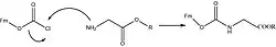 - C13H9−CH2−OC(O)NHR + (CH2)5NH → (CH2)5NH+2 + [C13H8−CH2−OC(O)NHR]−