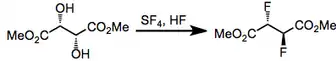 When vicinal diols are combined with SF4, difluorination occurs with inversion of configuration at only one of the alcohols. This was demonstrated in the synthesis of meso-difluorosuccinate from (L)-tartrate and the synthesis of (D)- and (L)-difluorosuccinate from meso-tartrate.[6]