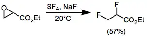 Fluorination opens epoxides to give either geminal or vicinal difluorides in most cases. Monoarylepoxides give geminal products with migration of the aryl group. Yields are low for sterically hindered di- and trisubstituted epoxides. Epoxides substituted with an ester group give vicinal difluorides via an alkoxysulfur trifluoride intermediate.[9]