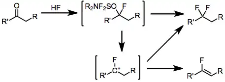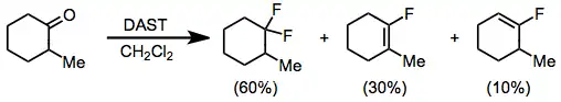 Aldehydes and ketones react with DAST to form the corresponding geminal difluorides. Fluorination of enolizable ketones gives a mixture of the difluoroalkane and vinyl fluoride. In glyme with fuming sulfuric acid, the vinyl fluoride product predominates.[11] Electron-rich carbonyl compounds, such as esters and amides, do not react with DAST or other aminosulfuranes.