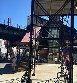 The other set of entrance/exit are stairs located at the south ends of each platform. These stairs lead to Fayette Street. There was formerly another station house at this end, but it was removed. These stairs were closed in the 1980s due to high crime,[19][20][21] but were reopened in July 2017 to address potential capacity constraints from shuttle bus transfers due to reconstruction on the Myrtle Avenue Line and the 14th Street Tunnel.[22][23]