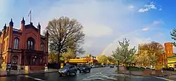 Flushing Town Hall is a performing arts center and historic town hall at 137-35 Northern Boulevard in the Flushing neighborhood of Queens in New York City. It served as the seat of government of the village of Flushing until the village became part of City of Greater New York in 1898. It was built in 1862 and is a 2-story, three-by-six-bay, brick building with basement and attic. A style of architecture that originated in Germany, Rundbogenstil ("round arch style"), was used here and in a number of American buildings of the Civil War Era. The earliest photographs show the building to have been painted a light color. The use of paint was discontinued following adhesion problems during a restoration. A small rear wing was added in 1938 containing a block of jail cells. The front facade features a triple arched portico topped by a classic entablature with low balustrade.[2]