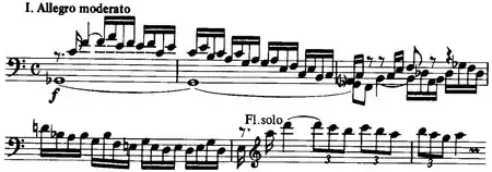 - The 11-minute Allegro moderato first movement varies between D minor, E-flat minor and F major. Solo passages, dialogues between solo flute and orchestra, and a clarinet and bassoon conversation characterize the music. After an unexpected bass trombone disruption, the flute comes to the fore with a cantabile theme in E major. An orchestral cadenza leads back into the opening themes before terminating calmly in a key approximating G flat major. Much of the content of this movement resembles chamber music between the flute and various instruments.[2]