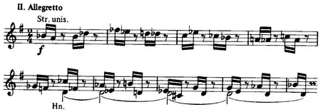 - Nielsen describes the opening of the 7-minute second movement as having "a little nastiness in some notes cast forth by the orchestra, but the atmosphere quickly relaxes again, and, when the solo flute enters, it does so with childish innocence." The movement's melodious start fluctuates between Allegretto and Adagio before settling into a Tempo di marcia variation on the melodic opening. The bass trombone introduces a final series of playful slides, bringing the work to an end.[4][5]