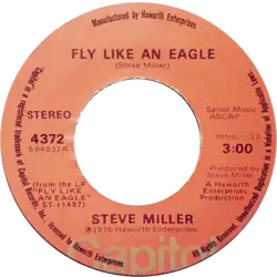 "Fly Like an Eagle" is a song written by American musician Steve Miller for the album of the same name.[5] The song was released in the United Kingdom in August 1976 and in the United States in December 1976.[1] It went to number two on the US Billboard Hot 100 for the week of March 12, 1977. The single edit can be found on Greatest Hits (1974–1978). It is often played in tandem with "Space Intro". On the album, the song segues into "Wild Mountain Honey".