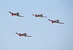 The Flying Lions Aerobatic Team is a South African formation aerobatic team. They fly a four-ship aerobatic display using North American Harvard aircraft.[1] The team operates five aircraft but only uses four in their display, leaving the fifth to be used as a backup.[2][3] The Flying Lions have been in operation since 1999 when Arnie Meneghelli acquired the Harvard aircraft that the South African Air Force was decommissioning.[4][5] The Flying Lions participate at many major airshows around South Africa during the airshow season.[4]