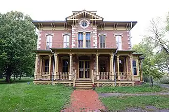 The house was built from 1867 to 1871 in the Italianate style for Martin and Ellen Flynn. They named their home Walnut Hill. The two-story brick house was built for $20,000. It has a hipped roof, cupola, wide bracketed eaves, narrow double-paned windows with hoods, a porch, and heavily molded double doors. Originally, the exterior was not painted.[2] There is a small wing on the back of the house with a side porch and simple roof brackets. A pre-cast cement addition was built onto the rear wing in the 19th century. The mansion sits on top a hill that overlooks the surrounding farmland and a stream.