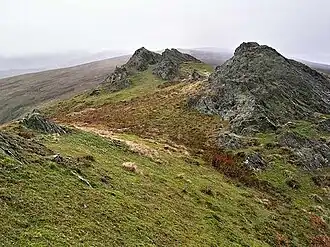 The summit is grassy, and unmarked. To the north lies Tomle, while to the south lies its Mynydd Tarw.[1]
