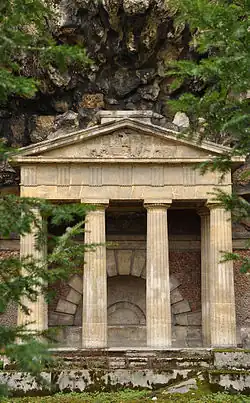The Scottish gardener Thomas Blaikie described the Folie this way: "This garden is, without doubt, an example of extravagance rather than taste. There is a rock built in front of the house, or rather an arch made of great blocks of stone over which water seems to flow. But although it was built at great cost, it has nothing to do with nature or natural beauty, since the rocks are mixed with carved stones, and there is a small Corinthian temple in the centre, and all the rest is equally ridiculous, because there is no mountain or height in the vicinity to form this enormous mass of rocks."[2]