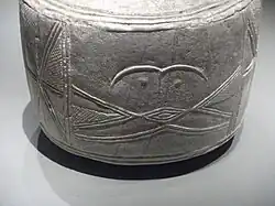 The three drum-like forms are made of locally quarried chalk and are decorated with stylized human faces and geometric patterns. On the top of the cylinders are a series of concentric circles and two of them have pairs of eyes that schematically denote a human face. The decoration of the drums has similarities to objects made in the Beaker culture and early British Bronze Age, including the use of chevron and lozenge forms.[6][7]