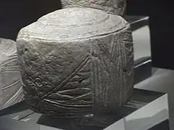 The Folkton Drums are a very rare set of three decorated chalk objects in the shape of drums or solid cylinders dating from the Neolithic period. Found in a child's grave near the village of Folkton in northern England, they are now on loan to Stonehenge Visitor Centre from the British Museum.[1] A similar object, the Burton Agnes drum was found 15 miles away near Burton Agnes in 2015,[2] and another example, the Lavant drum, was excavated in 1993 in Lavant, West Sussex.[3]