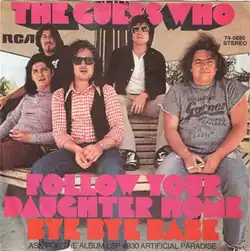 "Follow Your Daughter Home" is a song written by Burton Cummings, Donnie McDougall, Garry Peterson, Bill Wallace, and Kurt Winter and performed by The Guess Who. It reached #20 in Canada[3] and #61 on the Billboard Hot 100 in 1973.[4] The song was also released in the United Kingdom as a single, but it did not chart.[5] The song was featured on their 1973 album, Artificial Paradise.[6] The song has a calypso-influenced melody.[7]