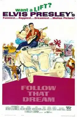 Follow That Dream is a 1962 American musical comedy film made by Mirisch Productions and starring Elvis Presley. The film was based on the 1959 novel Pioneer, Go Home! by Richard P. Powell. Producer Walter Mirisch liked the film's song "Follow That Dream" and retitled the picture accordingly.[2] The film reached #5 on the Variety weekly Box Office Survey, staying on the chart for three weeks, and finishing at #33 on the year-end list of the top-grossing movies of 1962.