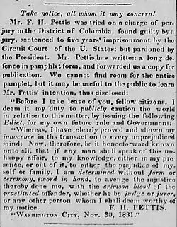 Following Pettis' conviction on perjury charges in the District of Columbia, sentence to prison, and pardon by a U.S. president, Pettis mailed out pamphlets promising to murder "without form or ceremony" anyone who mentioned the case in public.[17] This pamphlet appears to be the seven-page document recorded in the Bibliotheca Americana as item w.61301 "PETTIS (F. H.) Letter to the People of the United States, Nov. 30, 1831. By F. H. Pettis. Washington. 1831."[18] The American Antiquarian Society may hold a copy in their library in Worcester, Massachusetts.[19]
