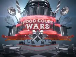 Food Court Wars is an American competitive reality television cooking show on the Food Network that puts two teams of entrepreneurs in a shopping mall together with the teams having to battle each other in order to win a food court restaurant of their own, rent-free, for a year.[1] Each week's show is at a different city mall in the United States. The malls want to open a new "local" eatery in the mall's food court that offer a fresh, region-specific menu.[2] The teams test, market, then run their concept for a full day feeding shoppers.[3] The team restaurant that makes the most profit at the end of the day wins their eatery space, which is a prize worth an estimated $100,000, and the losing team must vacate the premises. The show premiered on July 7, 2013.[3][4] The first season finale, which was a rebroadcast of the pilot episode, aired on August 18, 2013. Season 2 premiered on February 23, 2014, and consisted of thirteen episodes.[5]