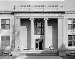 The building itself is not as significant as the Depression era artwork contained within it.[2] Christian Petersen, a Danish immigrant, designed and completed the nine bas reliefs from 1934 to 1935 as part of the Public Works of Art Project (PWPA). Two plaster-cast panels are located in the foyer. One depicts a woman from biblical times churning butter in a goatskin bag hung from a tree, and the other depicts an American pioneer women using a dash churn, an early American invention. They were completed in 1934.