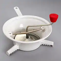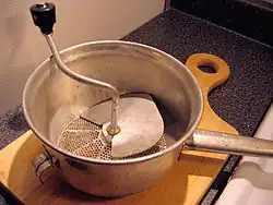 A food mill (also called passatutto, purée sieve, moulinette, mouli légumes, passe-vite, or triturator) is a food preparation utensil for mashing and sieving soft foods invented in Brussels in 1928 by Victor Simon.[1] Typically, a food mill consists of three parts: a bowl, a bottom plate with holes like those in a colander, and a crank fitted with a bent metal blade that crushes the food and forces it through the holes in the plate. The bottom plate may be a permanent part of the device, or interchangeable plates with different hole sizes may be supplied. Three corrugated feet on the base, or two ears on the rim plus the handle, fit on the rim of a cooking pot and hold the mill in position over it.