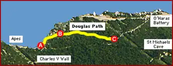 Douglas Path is a path that connects a series of military installations at the top of the Rock of Gibraltar. It leads from the top of Charles V Wall to Mount Misery, one of the peaks of the Rock, before proceeding southwards to end at Douglas Cave. The first section of the path climbs a steep set of steps before running along a knife-edge ridge. It has views over both sides of the Rock of Gibraltar. The sheer east face of the Rock and the Great Gibraltar Sand Dune, which covers a large part of the eastern slope, can readily be seen. The vista provides sweeping views over the Bay of Gibraltar to the west and the Mediterranean Sea to the east.[14] The path was cut by convict labour to facilitate troop movements on the Upper Rock.[6]