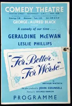 For Better, for Worse is a comedy play by the British writer Arthur Watkyn. It was first performed at the Q Theatre in Kew Bridge in 1948. It enjoyed a lengthy and successful run at the Comedy Theatre in London's West End where it lasted for 618 performances between 17 December 1952 and 12 June 1954. The original West End cast included Leslie Phillips, Geraldine McEwan, Tom Macaulay, Anthony Sharp, Gwynne Whitby, Polly Elwes, Aimée Delamain, Charles Lamb and Dandy Nichols. It was directed by Kenneth Riddington who also appeared in the cast.[1] The plot revolves around the trials and tribulations of a newly-married couple.