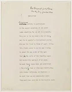 - ^ a b c "ROBERT FROST’S ORIGINAL POEM FOR JFK’S INAUGURATION NOW ON DISPLAY AT THE KENNEDY PRESIDENTIAL LIBRARY." John F. Kennedy Presidential Library and Museum press release. July 19, 2006. Accessed January 21, 2021.