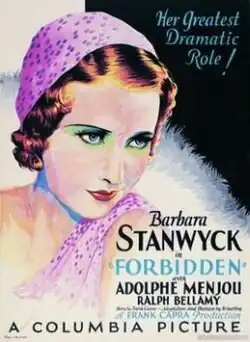 Forbidden is a 1932 American pre-Code melodrama film directed by Frank Capra and starring Barbara Stanwyck, Adolphe Menjou, and Ralph Bellamy. An original story inspired by the 1931 novel Back Street by Fannie Hurst, with a screenplay by Jo Swerling, the film is about a young librarian who falls in love with a married man while on a sea cruise.[1][2]