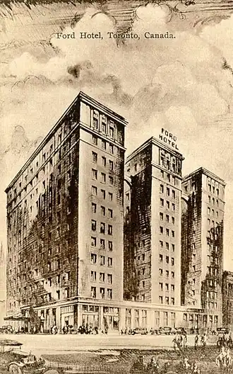 The Ford Hotel was a historic hotel in central Toronto, Ontario, Canada. It was one of five hotels in the R.T. Ford & Company hotel chain and was identical to the Ford Hotel, Buffalo and Ford Hotel, Montreal.[1] The 750-room hotel consisted of three 12-story wings connected at the rear by a perpendicular spine atop a one-story base contained the lobby, restaurants and other amenities. The structure was located on Dundas Street West, east of Bay Street. It was built in 1928 and for several decades was one of the city's most prominent hotels. The hotel was next to the Toronto Bus Terminal and provided cheap rooms for lower income travellers. It was also well known as a site for crime and vice. The Toronto Star called it the "rendezvous of choice for couples pursuing an illicit affair."[2]