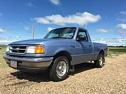For 1989, the Ranger underwent a mid-cycle redesign with new front fenders, a restyled hood and grille, and flush-mounted composite headlamps (with larger marker lamps). To further improve aerodynamics, the front bumper was redesigned and enlarged to fit more closely with the front fenders.[18][7] Badging was revised; the fender icons were restyled, and the "FORD" lettering on the right-hand side of the XLT-significant tailgate trim panel was switched for a blue oval. The interior was given a redesign, including new door panels, new seats, and an all-new dashboard (introducing a glovebox).[18][7] To improve ergonomics, the instrument panel was redesigned for improved legibility, with automatic transmission Rangers receiving a column-mounted gearshift; manual-transmission versions saw the removal of the key-release button from the steering column.