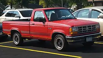 Slightly larger than the Courier, the first-generation Ranger was approximately 18 inches shorter and 11 inches narrower than an equivalently configured F-100/F-150.[5] While proportioned similar to the Chevrolet S-10 and Japanese-sourced compact trucks, it adopted exterior design elements from the F-Series, including its twin headlamps, chrome grille, "FORD" tailgate lettering, tail-lamps, and cab proportions.[18] In line with the Courier, the Ranger was offered with two pickup bed sizes; a standard 6-foot length and an extended 7-foot length. In 1986, a third configuration was introduced with the advent of the Ranger SuperCab. Extended 17 inches behind the front doors for additional cab space, the SuperCab was offered with the 6-foot bed length; four-wheel-drive SuperCabs were sold only with V6 engines.[18]