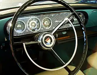 The same shape was carried over to the interior of the car where the main dials and controls on the dashboard were surrounded by a thick frame in that oval shape. The repetitious use of a single simple shape at different levels of the design gave the overall car a consistent visual unity which was in stark contrast to the high finned flamboyance of the previous Taunus 17M and was seen at the time as a radical switch by Ford of Germany away from American styling in favour of European styling.[1] There were no tails fins and there was very little decorative chrome included. The efficiency of its superficially much more simple design enabled Ford to boast that the 1960 car, despite being fractionally narrowed on the outside, offered usefully more interior width than the car it replaced.