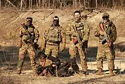 Prior to its open involvement in 2022, especially during the first peak of the war in Donbas between 2014 and 2015, Russia had previously tried to deny any formal intervention in Ukraine and portrayed Russian forces in the country as either part of local forces[20] or Russian citizens voluntarily fighting in the country.[21][22] These units have been referred as "little green men" by Western and Ukrainian media and as "polite people" by Russian media.[23] The Russian government-supported private military company Wagner Group, largely composed of former Soviet, Eastern European and Syrian soldiers, is deployed in Ukraine to secure Russian interests while maintaining the deniability of formal Russian involvement.[24]