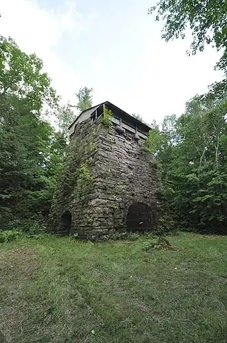 The furnace was established in 1810 by John Smith of Leicester, Vermont, and was in operation, under a variety of names and owners, until 1855. Brown hematite ore from nearby beds was processed with local charcoal to produce iron, which was formed into utilitarian implements such as stoves, agricultural implements, and hardware. The works was not particularly efficient, and its sales were hampered by a poor transportation network. More advanced and better-connected works, particularly in Troy, New York, contributed to its downfall, and the site was abandoned in 1855. It was given to the state in 1974.[2]