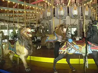 When the carousel was reinstalled in the 1970s, it was cited as having 36 moving horses, 13 stationary horses, three menagerie figures (a panther, lion, and stag), and two chariots.[19][18] By the 21st century, the current carousel included a wooden lion, deer, and tiger, although the horses[c] and two chariots remained in place.[11][20] The horses, animals, and chariots are placed in three rows on a two-level rotating platform.[11][20] The stationary horses are in the outermost row and are the largest, while the middle and innermost rows have progressively smaller moving horses.[21] They generally contain military motifs such as bedrolls and saddles.[11][20] Each of the horses has a different hand-carved design in oil paint; some of the horses have tucked heads.[22] The horses also have a large number of realistic features: for instance, the tails consist of genuine horse hair, and the horses have glass eyes.[11]