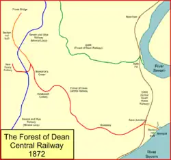 Note: Cobb shows the Forest of Dean Central Railway making a converging junction with the Mineral Loop of the Severn and Wye Railway, but this is a mistake. It crossed it, although both railways eventually had a connection to New Fancy Colliery.[8]