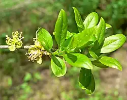 Forestiera pubescens, commonly known as stretchberry,[5] desert olive, tanglewood, devil's elbow, elbow bush, spring goldenglow, spring herald, New Mexico privet, or Texas forsythia is a deciduous shrub or small tree native to the southwestern United States (Texas, Oklahoma, New Mexico, Arizona, Colorado, Utah, Nevada, California) and northern Mexico.[6][7][8]