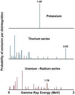 Each of these elements emits gamma-rays with distinctive energy. Figure 1 shows the energies of emitted gamma-ray from the three main isotopes. Potassium 40 decays directly to stable argon 40 with the emission of 1.46 MeV gamma-ray. Uranium 238 and thorium 232 decay sequentially through a long sequence of various isotopes until a final stable isotope. The spectrum of the gamma-rays emitted by these two isotopes consists of gamma-ray of many different energies and form a complete spectra. The peak of thorium series can be found at 2.62 MeV and the Uranium series at 1.76 MeV.