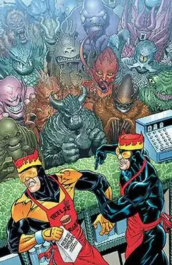 Super Buddies are a team of comic book superheroes in the DC Comics universe who appear in the six-issue Formerly Known as the Justice League miniseries in 2003,[1] and its 2005 sequel, I Can't Believe It's Not the Justice League (published in JLA Classified). The team is put together by former Justice League bank roller Maxwell Lord as a superhero team "accessible to the common man". The team is considered more or less inept and incapable of being of any help by many (including the actual Justice League). The team was created by writers Keith Giffen and J. M. DeMatteis, and artists Kevin Maguire and Josef Rubinstein.