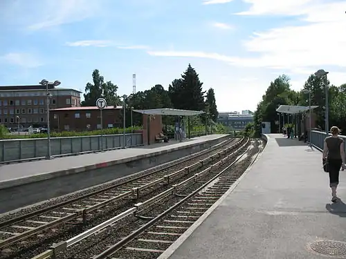 By 1994, the tram route to the new hospital appeared to have political support,[2] but by 1996 local politicians instead wanted to use Gaustad Station and buses to serve the hospital. There also arose a disagreement between the city and the state as to who should be paying for the light rail line, should it should be built.[3] Not until 1998 were the necessary political agreements in place to allow construction to start.[4][5] The new light rail started services on 1 June 1999,[6] and the rapid transit station opened on 22 August.[7] With the opening, line 4 was extended from Blindern, via Forskningsarken, to Ullevål stadion.[8] There were complaints from local residents that the increased traffic on the line was causing too much noise, and neighbors demanded that noise shields be built.[9] On 20 August 2003, the Ring Line of the metro opened, and line 4 started to also serve Nydalen and Storo.[7]