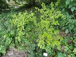 F. europaea is a shrub,[6] and can grow up to 10 ft (3 m) tall.[7] Its leaves are 5–8 cm (2.0–3.1 in) in length, and are generally entire (smooth edged).[8] It produces numerous yellow flowers,[5] which are 1.25 in (3.2 cm) in diameter.[7]