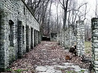 The Old Fort Belle Fontaine Cemetery was established in 1809, when Lieutenant Colonel Daniel Bissell moved the original Fort Belle Fontaine encampment to a new location. The cemetery was located about 100 yards or so southwest from the Cantonment buildings, which during the period of 1805 to 1826 had interments of at least 30–40 military officers, and about 100 enlisted soldiers.[3] The location was confirmed to be along the bluffs on the south bank of the Missouri River about a hundred yards southeast along the bluff past the old abandoned block house, when W.T. Norton visited the site in 1911. The old cemetery on the bluff was strewn with rocks and mortar, the debris of old tombs. All the tombs were in a more or less ruinous condition. The tombs were built of masonry, about two feet above the ground, and upon them rested the memorial tables. Most of the inscriptions were illegible.[4] In 1904, newspaper stories, most notably in The St. Louis Republic, recorded the recovery and moving of 33 burials with headstones to the new Jefferson Barracks National Cemetery. A considerable number of unmarked burials remain at the now-decertified cemetery. The article in The St. Louis Republic included rough photos and drawings of the site.[5] This old cemetery is not related to the Bellefontaine Cemetery established in 1849 on the road leading to Fort Belle Fontaine, and initially called the Rural Cemetery.[6]