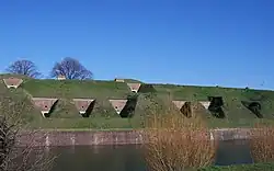 The fort was surrounded by a moat and the entrance on the southeast side was approached by a drawbridge much like a medieval castle. This led to a circular keep, also moated, which served as a place for local defence, being equipped with twenty light guns. The nineteen heavy guns of the main armament were mounted on the ramparts reached by two ramps on the enclosed parade ground in the middle of the fort. A lower tier of eight guns, four in casements, on each flank provided cross fire support with Elson and Rowner. Beyond the moat on the north side was a triangular redan accessed by a covered way to allow riflemen to cover attempts to bridge the moat. Similarly there were caponiers at the angles of the ramparts to allow riflemen to cover the moat.[9]