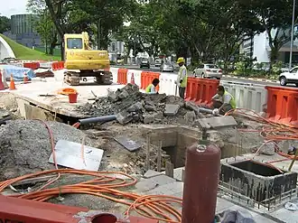 To make way for the construction process, the old National Library was demolished and moved to its present location along Victoria Street.[5] Sections of Canning Rise were closed twice during the course of construction. First, a stretch of road was closed for three months from 1 July 2004.[2] After this, a different section was closed "to facilitate the reinstatement works" of the FCT from 25 April 2006 for a period of two months.[10] However, this second closure was extended to 31 August.[11] In addition, a section of Stamford Road was temporarily redirected through the SMU campus near Prinsep Street during construction[4] before its final realignment in front of the National Museum.[3]