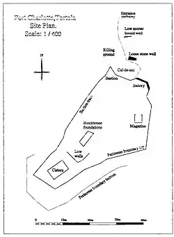 Fort Charlotte formed part of a triangular defensive formation around Road Harbour. On the south west side of the harbour lay Fort Burt while Fort George was situated on the west with Road Town Fort located in between. Towering above was Fort Charlotte, with the range and guns to fire on any ship entering the harbour without any fear of return fire. Accordingly, any ship seeking to attack the town would have to withstand fire from both Fort Charlotte and either Fort Burt or Fort George, but would have to actually land and climb Harrigan's Hill (with weaponry) to a height of nearly 900 feet before they could actually return fire on the garrison.