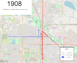 In 1977, the Fort Collins Junior Women's Club proposed giving 1919-built streetcar 21 a cosmetic restoration, as the car suffered from years of exposure. This proposal evolved into a more ambitious plan to restore the car to operating condition, and restore a section of the former streetcar system as an operating heritage railway.[1] With this goal, the non-profit Fort Collins Municipal Railway Society (FCMRS) was formed on March 31, 1980.[5]: 27 A new carbarn was built at the west end of Mountain Avenue in 1982–1983, and car 21 was moved there on August 21, 1983. Volunteers from FCMRS then began restoring car 21.[5]: 28–29 Under an agreement signed in 1981, the city permitted FCMRS to restore a 1.5-mile (2.4 km) section of track along West Mountain Avenue and Roosevelt Avenue and operate the streetcar along it. The section of route chosen for restoration was part of the city's first streetcar line, opened in 1907.[4] A substation to provide 600Vdc electric power was purchased, and overhead wires were reinstalled along the route.