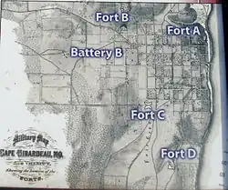 Fort D was garrisoned by Union troops from Illinois, Missouri, and other Midwestern states throughout the Civil War. The fort was never engaged in real combat; The Battle of Cape Girardeau, April 26, 1863, was fought west of the city.[4]