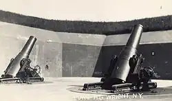 Following the American entry into World War I in April 1917, changes were made at the stateside forts with a view to putting some coast artillery weapons into the fight on the Western Front. The Coast Artillery Corps manned almost all US heavy and railway artillery in that war, with stateside forts reduced to a minimum garrison to provide gun crews in France. The forts were also important as mobilization and training centers. In 1917 the four 6-inch (152 mm) M1903 guns of Batteries Hamilton and Marcy were removed from the fort, mounted on field carriages, and sent to France.[2] However, a history of the Coast Artillery in World War I states that none of the regiments in France equipped with 6-inch guns completed training in time to see action before the Armistice.[4] A forcewide restructuring of 12-inch (305 mm) mortar batteries, generally removing half the mortars of each battery to speed reloading, resulted in Battery Clinton losing four of its eight mortars in 1918. In many cases the removed mortars were converted to railway artillery, and this appears to have happened to Battery Clinton's mortars, but none of these were sent to France.[2] None of the removed guns at Fort H. G. Wright were replaced, and in 1920 the carriages were ordered scrapped.[2] A battery of four 5-inch (127 mm) M1900 guns was proposed for North Hill in 1917, using two guns removed from Fort Terry and two from the nearby Fort Mansfield, but was never built.[1]