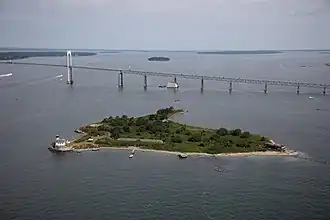 The earliest fortifications on Rose Island were built in 1780 during the American Revolutionary War around the time of the Battle of Rhode Island. Later construction took place from 1798 to 1801 but was left largely unfinished except for a long barracks building used by the U.S. Infantry. The Secretary of War's report on fortifications for December 1811 describes Fort Hamilton as "a regular unfinished work of masonry of four bastions, two of which are circular. (The fort can house) 300 men".[3] In the 19th century Fort Hamilton was used as a quarantine station for the port of Newport, and the island served as a popular picnic destination.[2] Starting in the late 19th century, the island became part of the U.S. Naval Torpedo Station, and during World War I and World War II the fort was used for munitions storage by the U.S. Navy as it conducted torpedo tests, also using facilities on nearby Goat Island and Gould Island. During World War II anti-aircraft guns were also added to the island, first Navy 5-inch guns and later Army 90 mm guns. The fort was added to the National Register of Historic Places in 2001.