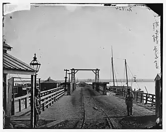 ![]() The Long Bridge and two of its guards, as seen from the Washington side of the Potomac River. | |