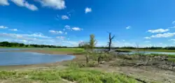 As a result, Fort James was founded on the west bank of the James River at its confluence with Firesteel Creek. It was first established in September 1865 by Captain Benjamin King, 6th Iowa Cavalry, as Fort La Roche or Fort Des Roche, on the orders of Brigadier General Alfred Sully.[4] Built as protection from outbreaks of Native American aggression, its detachments of troops were there to make prospective settlers feel safe.[5][6] The soldiers were the first non-Sioux to settle in the county and non-Sioux civilian settlement didn't begin until 1872, six years after the fort was abandoned.[7] It was also known as Camp Near Firesteel Creek and only became known as Fort James after its decommissioning.[8]